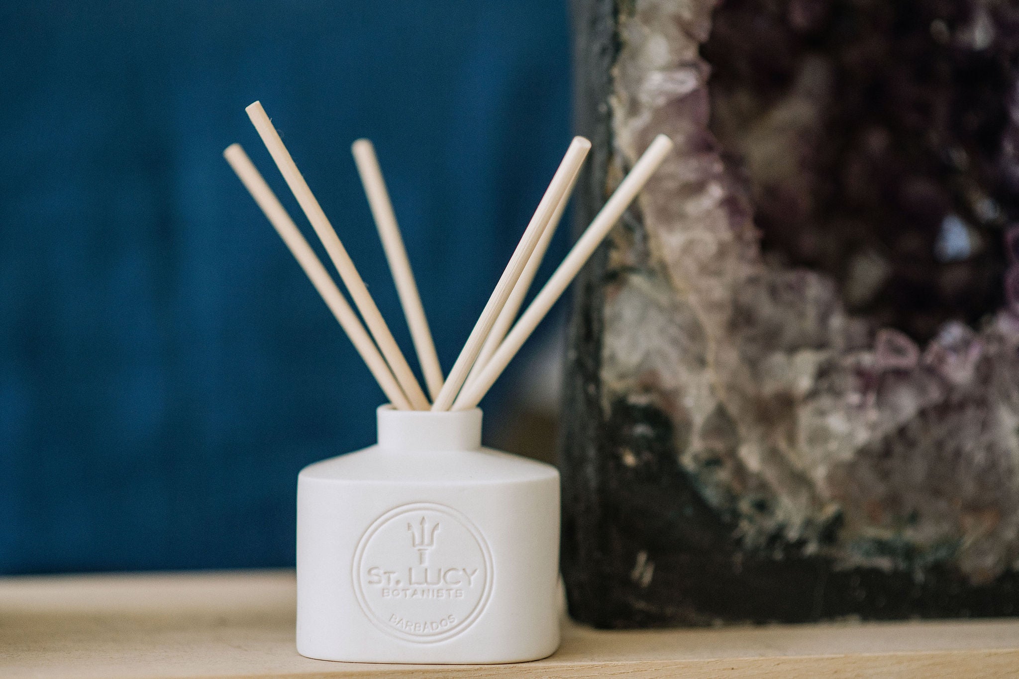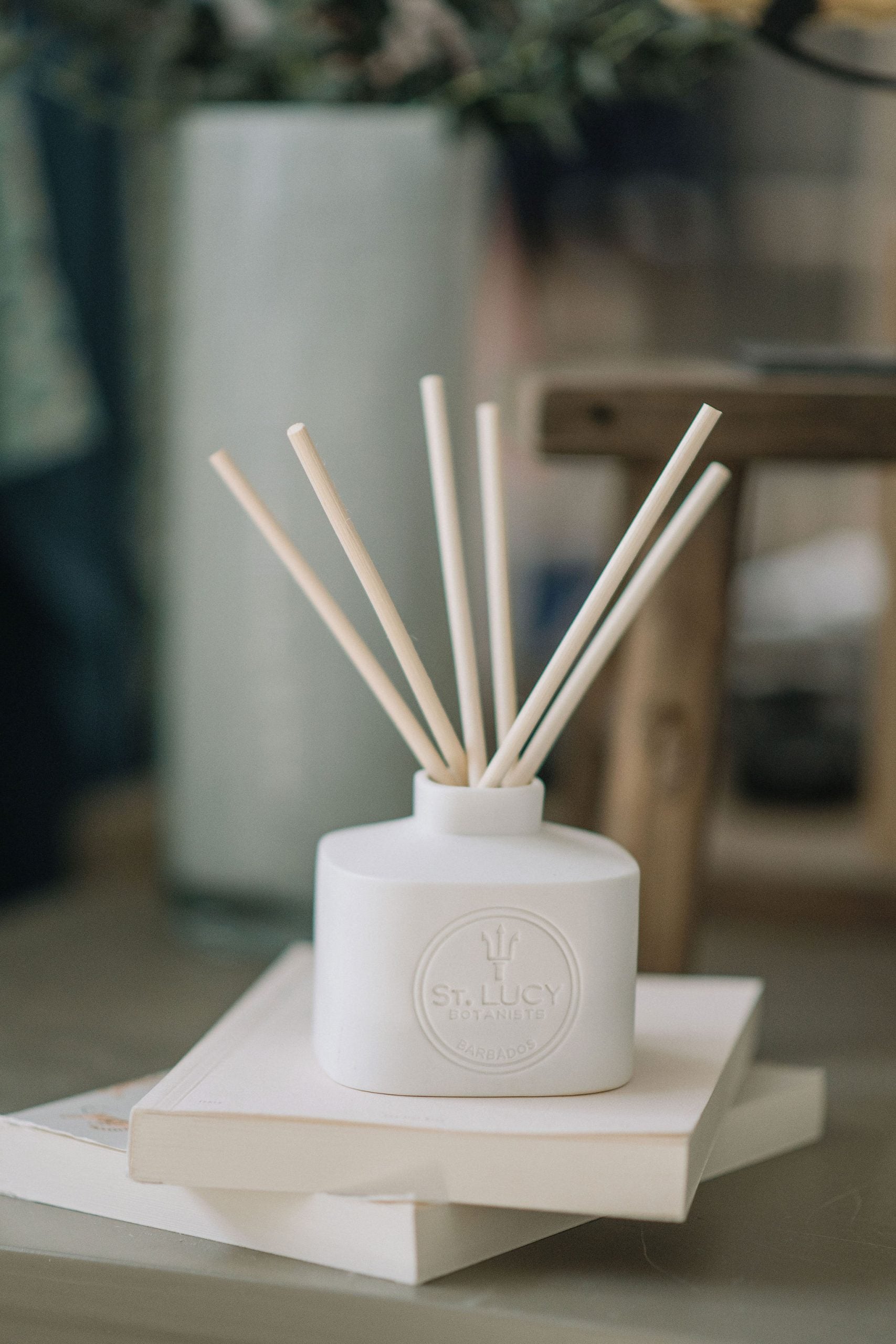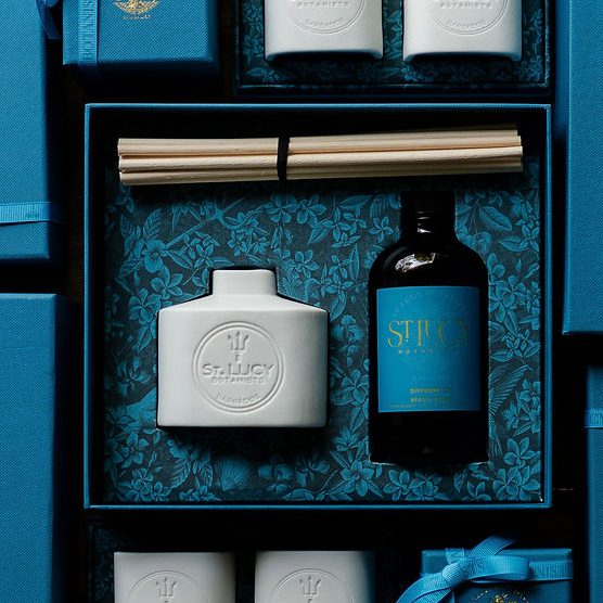 Endlessly refillable, the home fragrance diffuser with its rattan reeds disseminates the iconic scents of St. Lucy Botanists into large spaces, creating the perfect atmosphere at home
