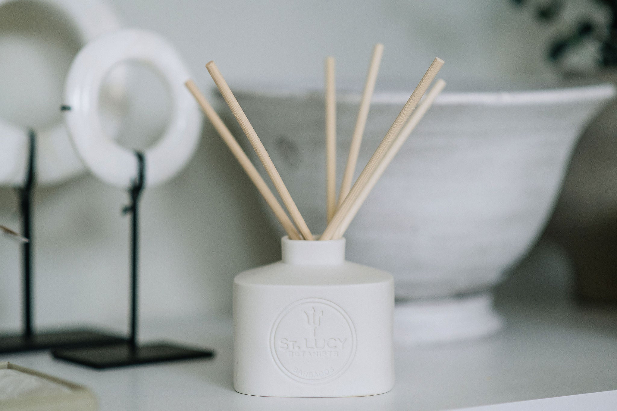 Endlessly refillable, the home fragrance diffuser with its rattan reeds disseminates the iconic scents of St. Lucy Botanists into large spaces, creating the perfect atmosphere at home.